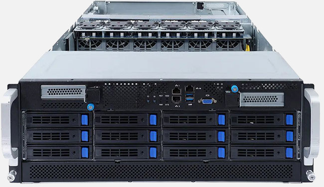 Up to 8x PCIe Gen4 GPGPU cards, dual 10Gb/s LAN ports, redundant power option.