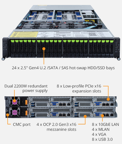 2U 4 Node System, 8x 10Gb/s LAN ports, 8x PCIe Gen4 expansion slots, redundant power options.