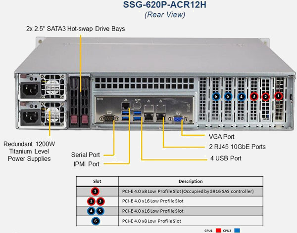 The Supermicro Storage SuperServer SSG-620P-ACR12H | SSG-620P-ACR12H boasts 6 PCI-Express slots for expandability, and as with all of our servers it can be fully customised online