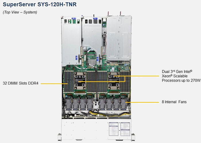 A 1U Supermicro SuperServer based on 2x Intel 3rd Gen Intel Xeon Scalable Processors range of processors, the Supermicro Hyper SuperServer SYS-120H-TNR | SYS-120H-TNR is configurable with up to 8x Hot-Swap Drives drive bays, and designed for optimal performance with 32x 3200Mhz DDR4 memory sockets .