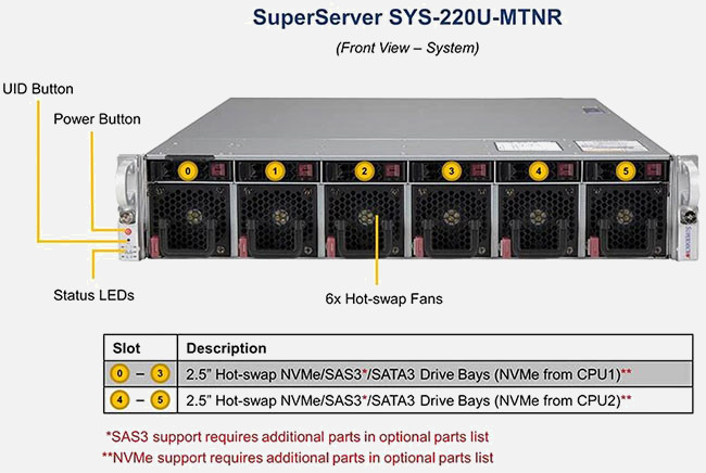 The Supermicro Ultra SuperServer SYS-220U-MTNR | SYS-220U-MTNR can be configured with 2.5" drives, a more space efficient and low noise option. These drives also offer energy savings and increased flexibility.