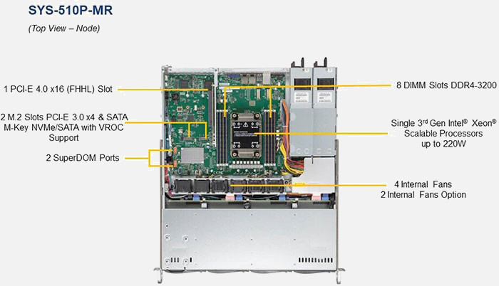 A 1U Supermicro SuperServer based on 1x Intel 3rd Gen Intel Xeon Scalable Processors range of processors, the Supermicro UP SuperServer SYS-510P-MR | SYS-510P-MR is configurable with up to 4x Hot-Swap Drives drive bays, and designed for optimal performance with 8x 3200Mhz DDR4 memory sockets .