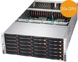 20x PCI-E 3.0 x16 supports up to 20x single width GPU, 24x hot-swap 3.5" drives, 2x 10GBase-T LAN port
